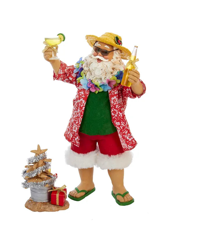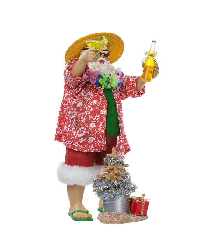 Part of Kurt Adler's Fabriché™ collection, this 10" Fabriché™ beach Santa set of 2 pieces is a fun and festive addition to any holiday décor! Santa Claus is featured here ready for a day at the beach . He is wearing a sun hat, sunglasses, and a tropical shirt (with white-trimmed red shorts, of course). He has a margarita in one hand, a beer in his other hand, and a sand Christmas tree at his feet!