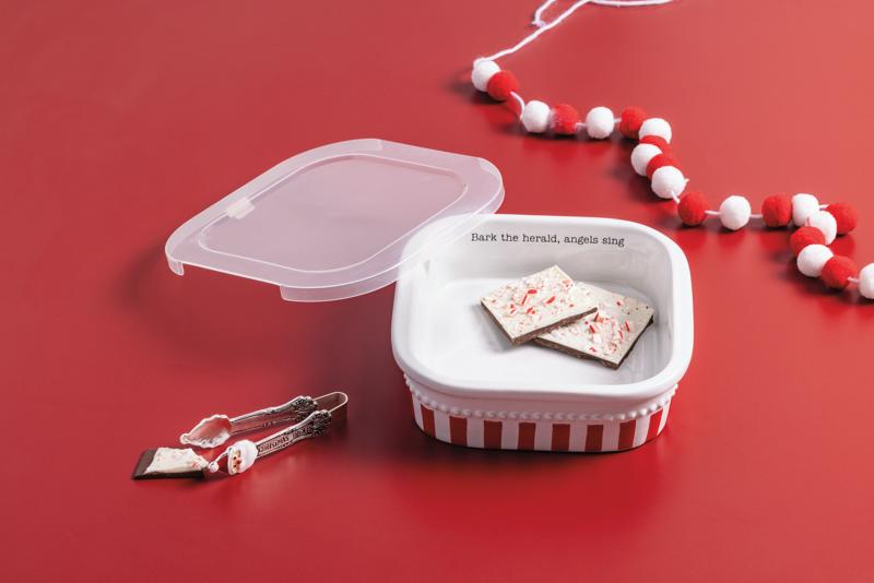 Peppermint Bark Box Set offers a delightful and festive way to store and serve your holiday treats. This charming 3-piece set includes a beautifully hand-painted ceramic storage box, perfect for keeping your peppermint bark fresh and ready to enjoy. The box is complemented by a secure plastic lid, ensuring your treats are protected. Accompanying the box is an adorable enamel Santa figure, adding a touch of holiday cheer to your kitchen decor. The set also features stamped silverplate tongs, ideal for serving your delicious creations with elegance. Additionally, a kraft Peppermint Bark recipe card is included, providing a classic recipe to inspire your holiday baking. The storage box measures 8" x 8", the tongs are 4 1/2" long, and the recipe card is 3" x 5", making this set a perfect addition to your festive gatherings. Crafted from durable dolomite, this set is both functional and decorative, making it a wonderful gift or a cherished addition to your own holiday collection.