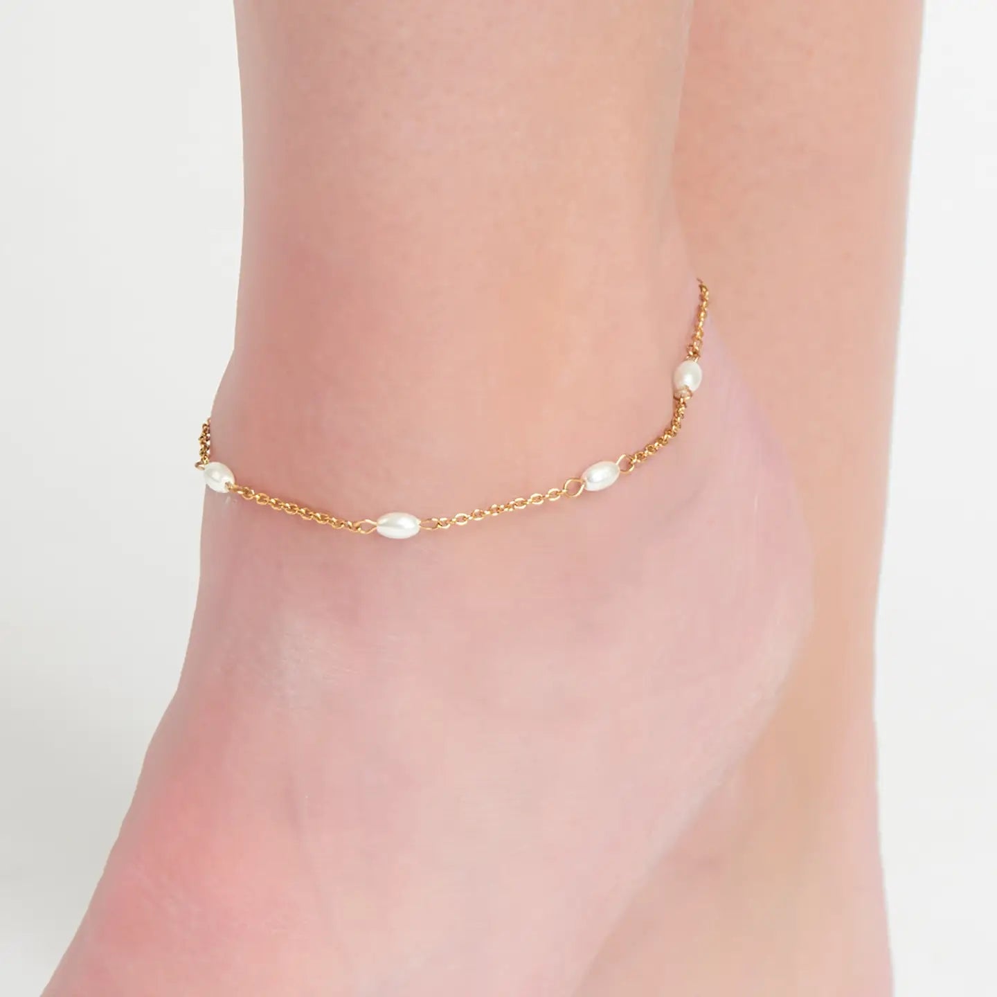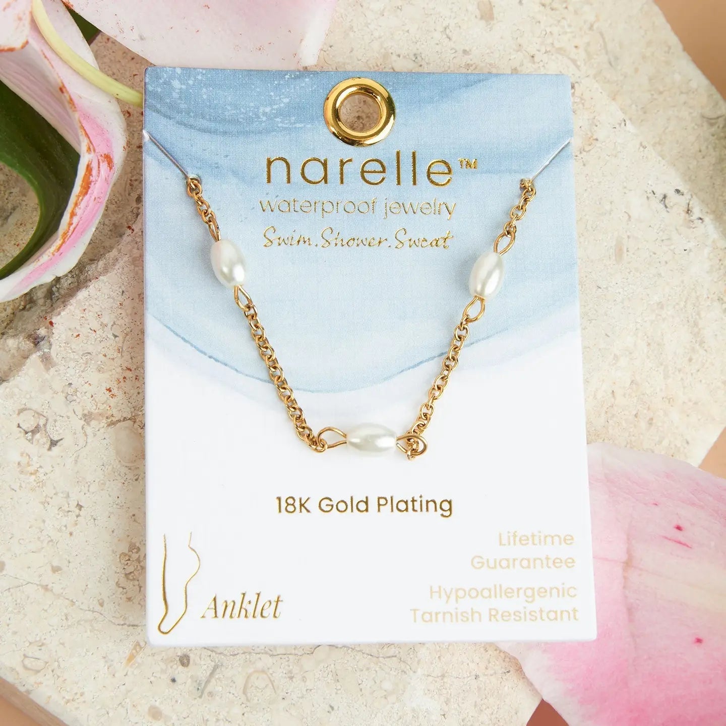 A modern take on a classic, the Narelle Waterproof Pearl Anklet a singular delicate chain in a classic gold with pearl accents. Designed to help you achieve an effortlessly minimalist look, this sweet anklet is the perfect finishing touch to any summer outfit. Waterproof, 18K gold plated and made with a specialized PVD technique to withstand the rigors of life, from swimming and showering to sweating through your most intense workouts, all without ever losing its shine. waterproof jewelry, gold jewelry, stainless steel jewelry, fade proof, tarnish resistant, water resistant, Real Gold Dipped, tarnish-free, non-tarnish, water proof, sweatproof jewelry, Fade Resistant, Anti-oxidation, enewton