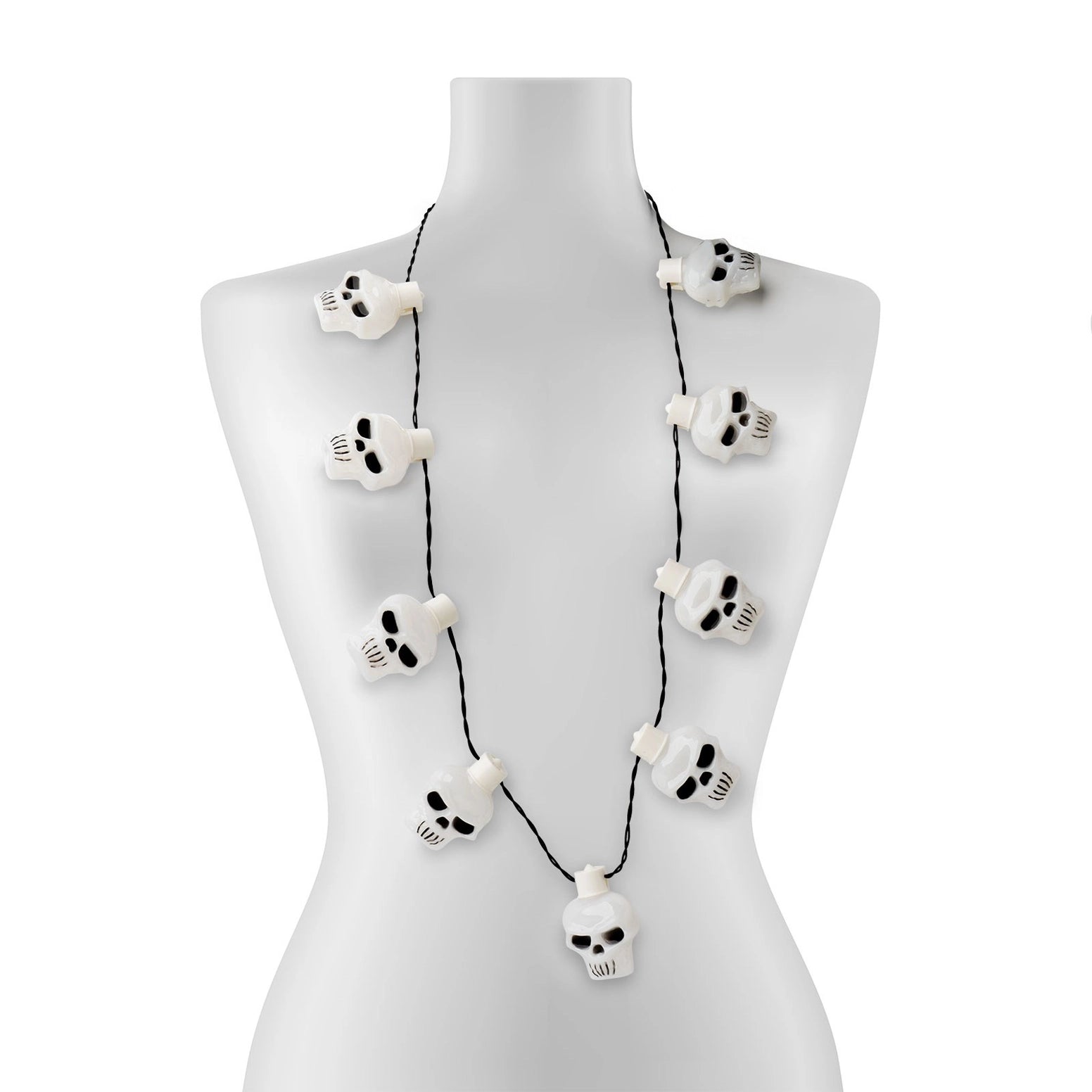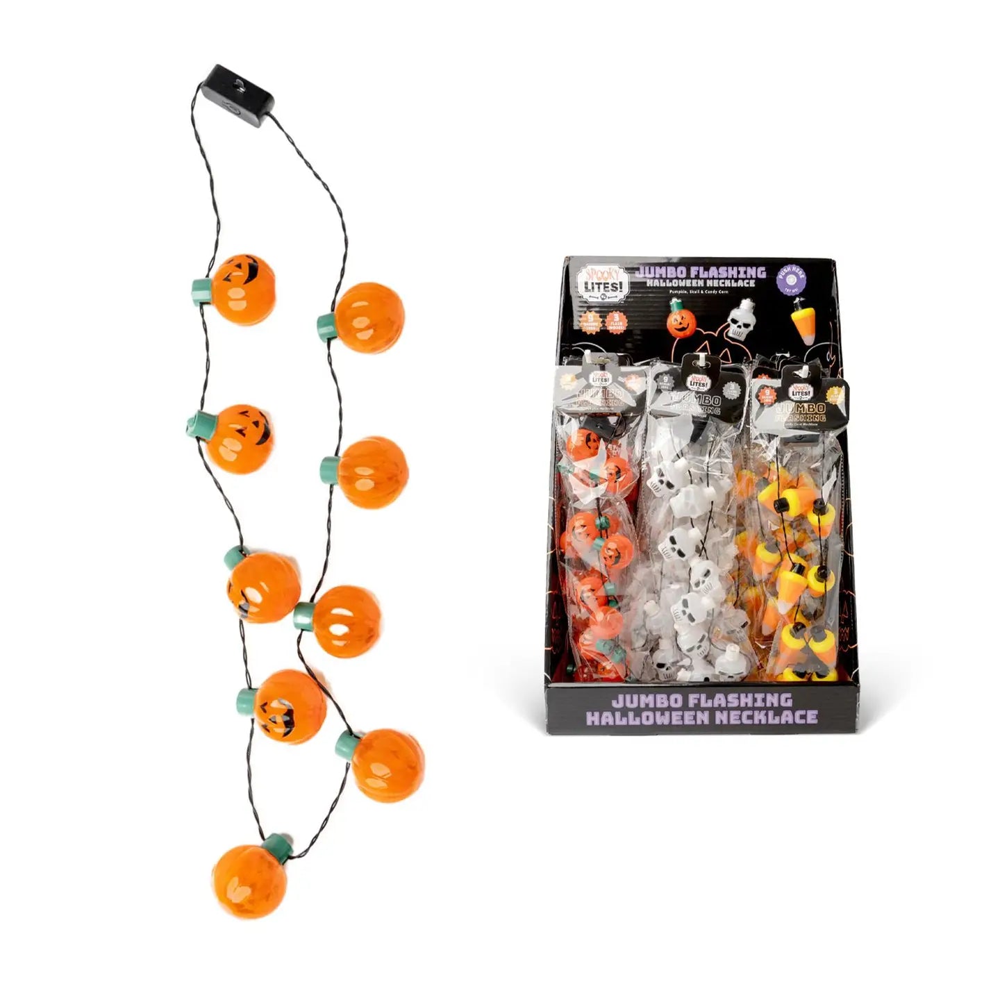 Halloween lights perfect for a last-minute costume, parties and trick-or-treating! Each necklace features nine ultra bright LEDs with three flash modes. Easy in/out prepacked display includes pumpkin, skull and candy corn shapes. -9 bright LEDs -3 flash modes -3 classic styles: pumpkin, skull, candy corn -Batteries included