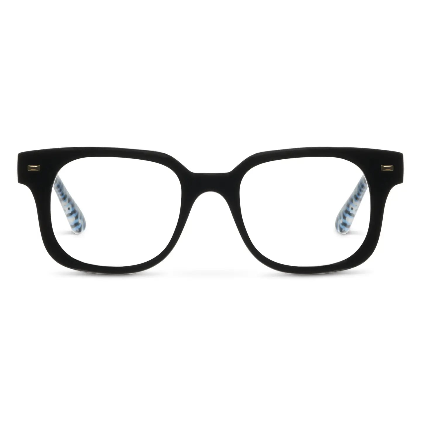 Glossary pairs a confident square shape with eye-catching details, from the metal pins on the front to the patterned print tucked along the interior temples. The result is a bold, balanced frame that brings a little bit of personality to whatever the day has in store