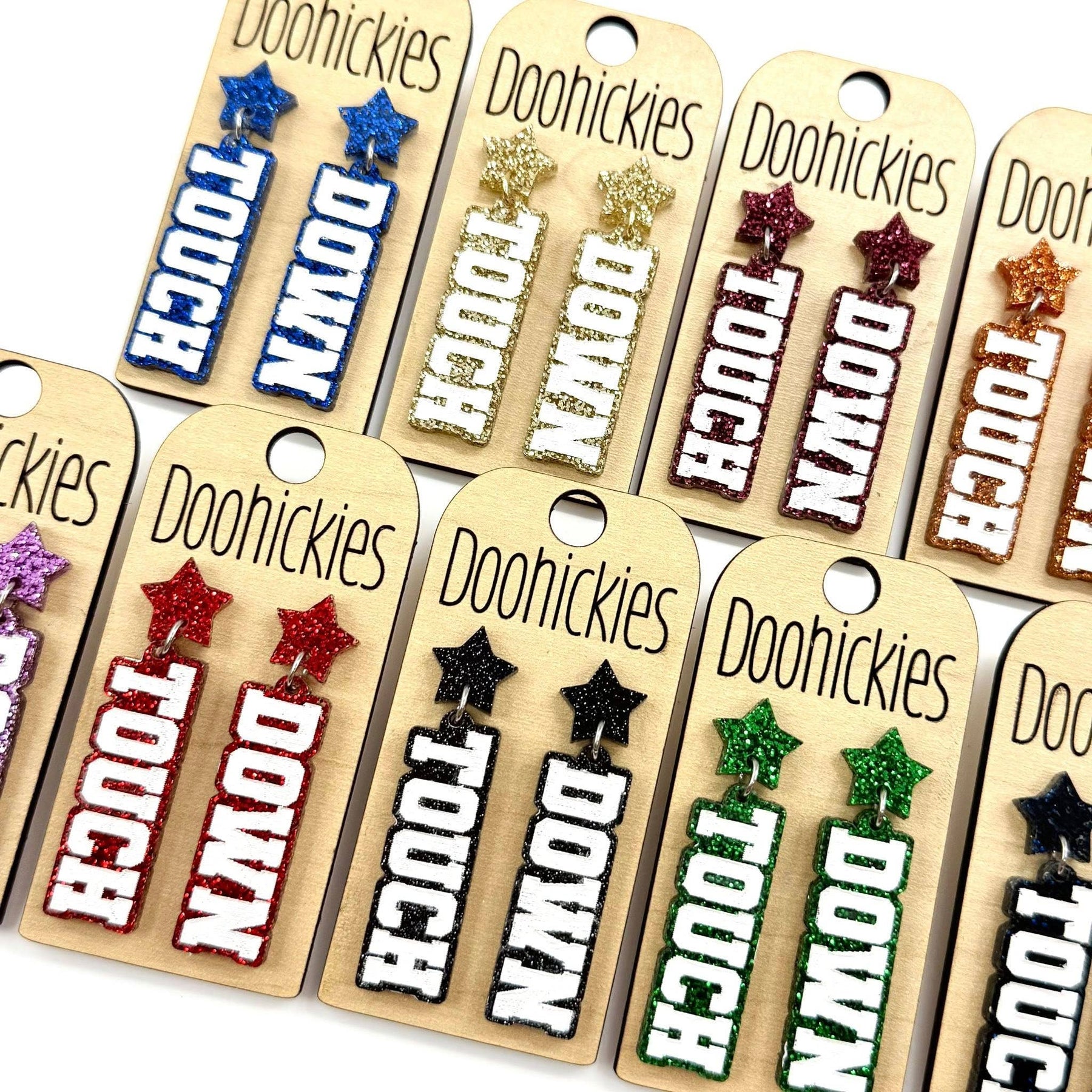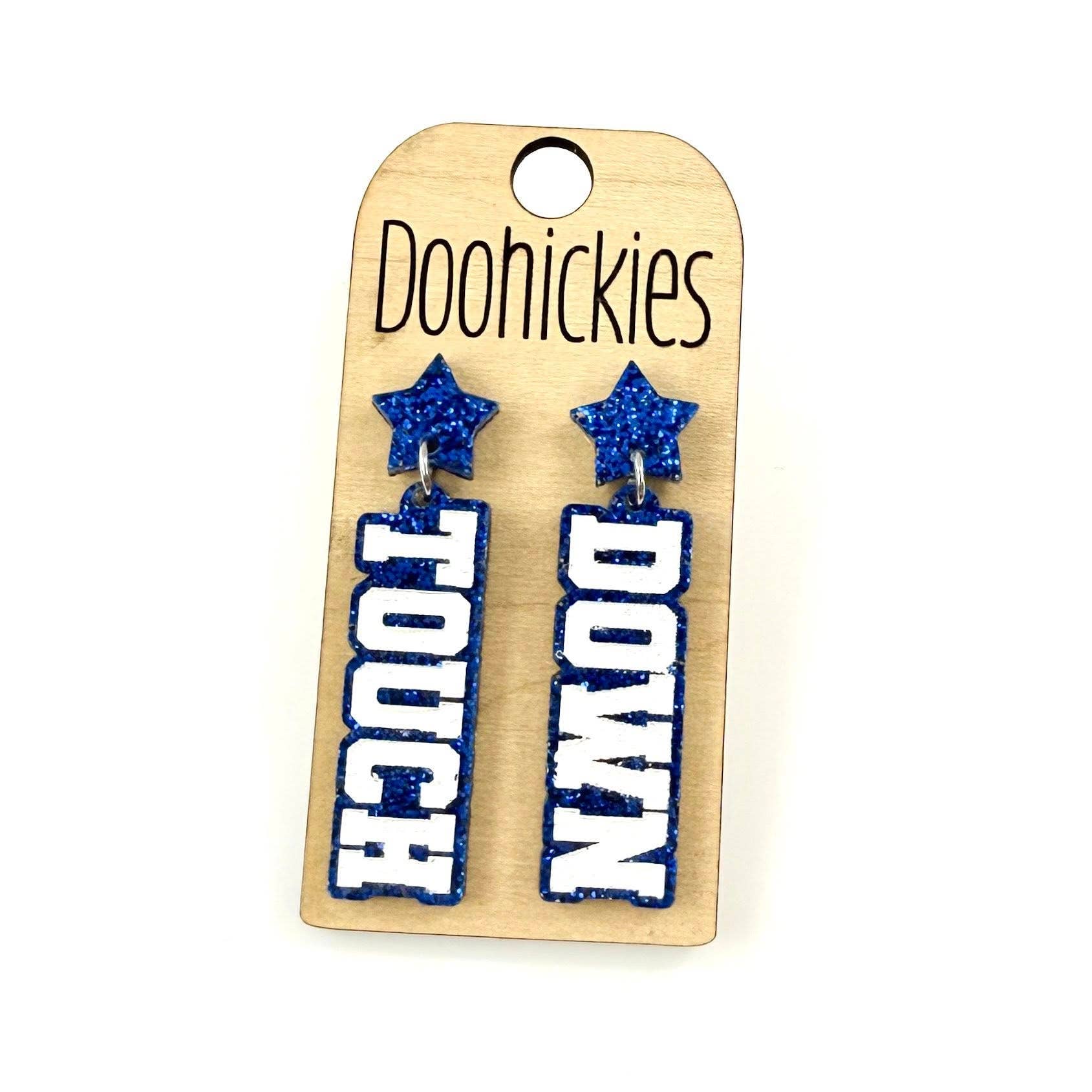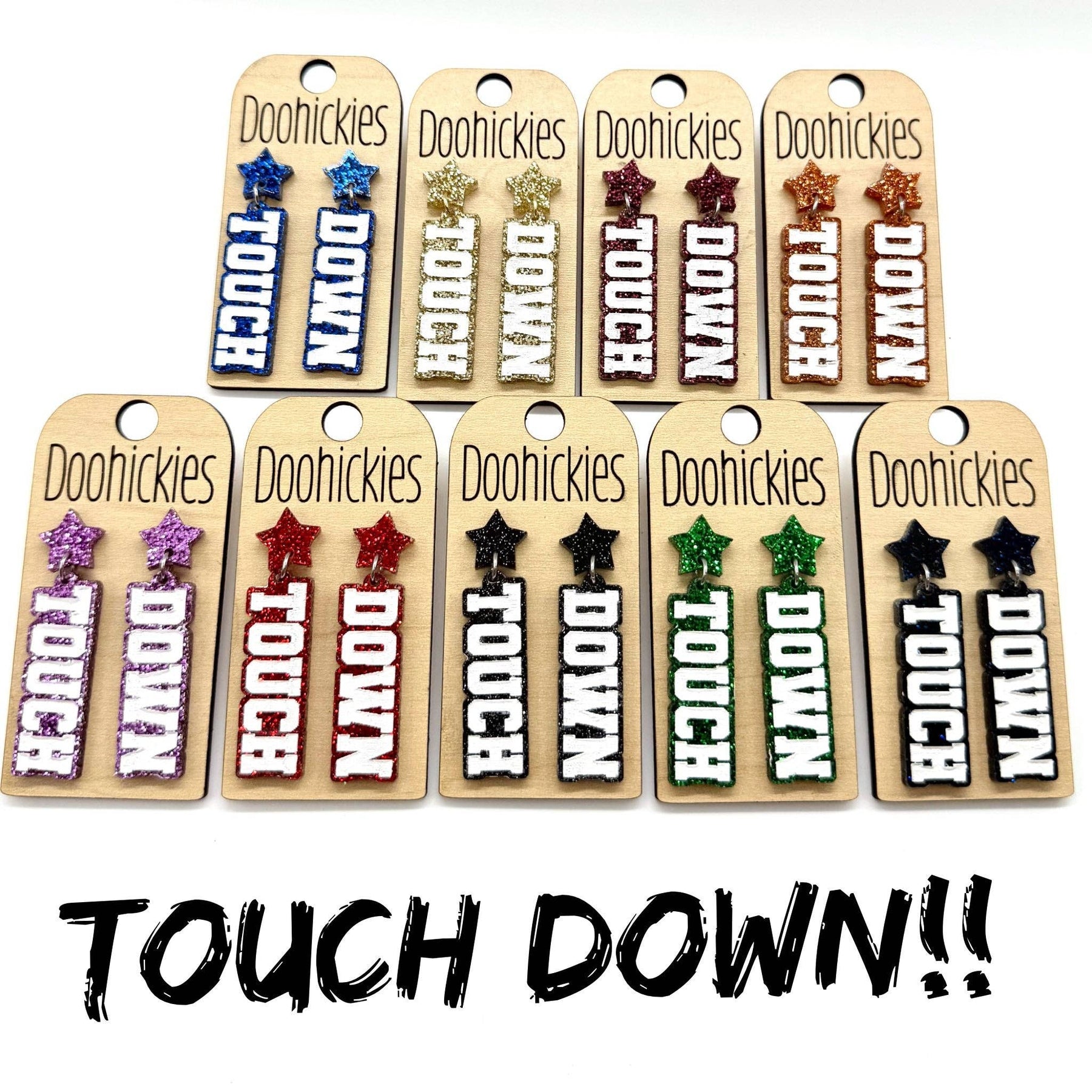 Add some extra sparkle to your school spirit with our customizable Glitter Touch Down Dangles! These quirky earrings will show off your team pride with a playful twist. Choose from a variety of glitter colors to make them truly unique. Go team! Dimensions: .5" x 1.75" Settings Type: Hypoallergenic & Stainless Steel** All settings are lead and nickel free** Materials: Acrylic Ship Time: Please allow up to 10 business days to ship. Lightweight Our earrings are HANDMADE by us in our shop in North Texas. Please, feel free to use our pictures. We do not recommend wearing our product in water.