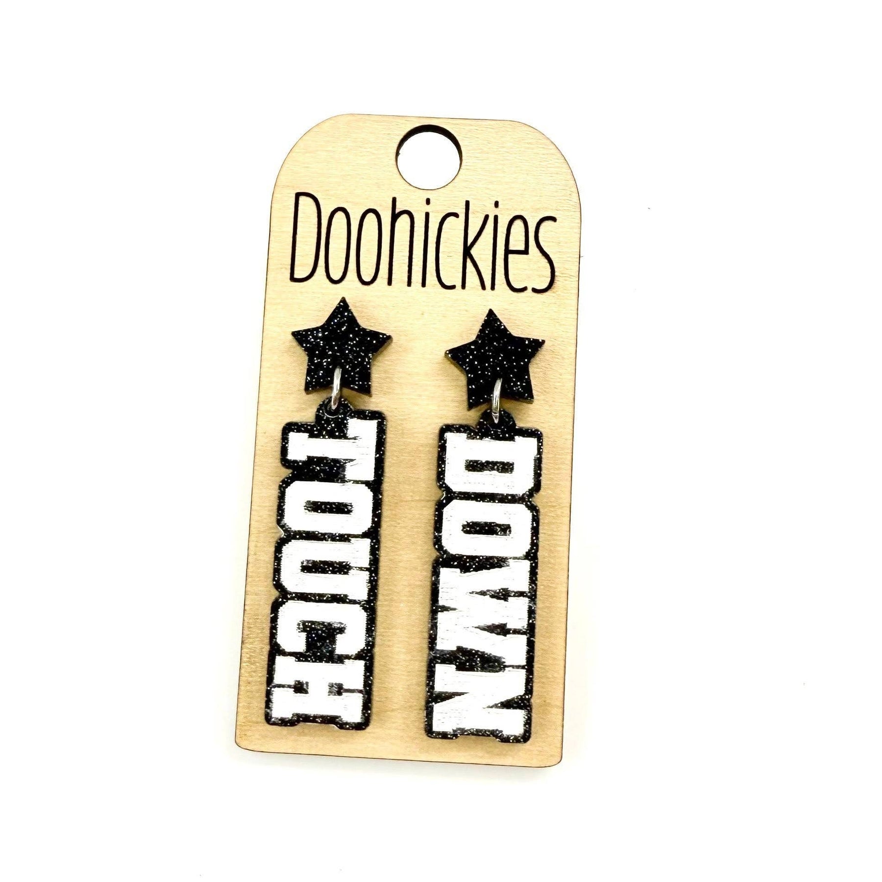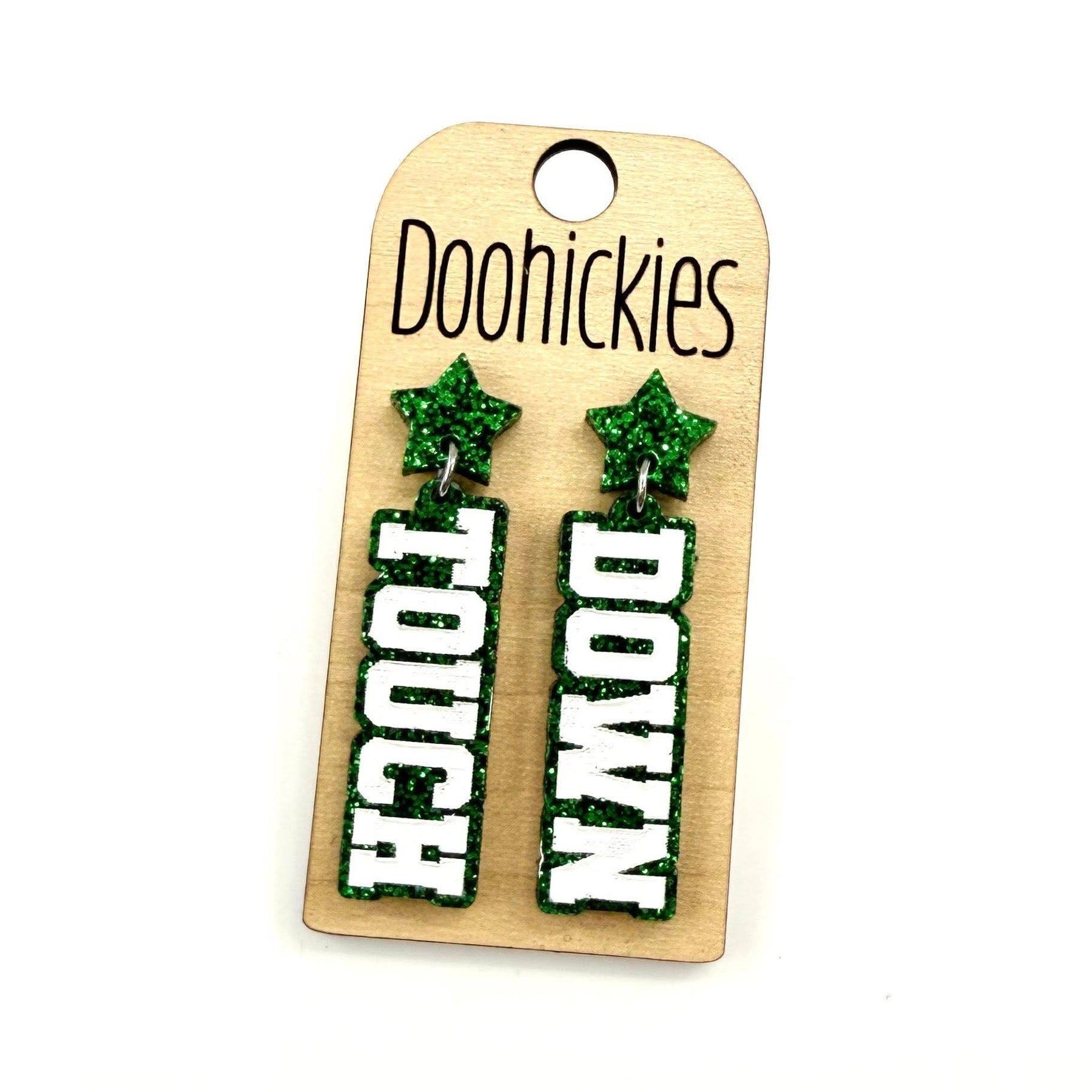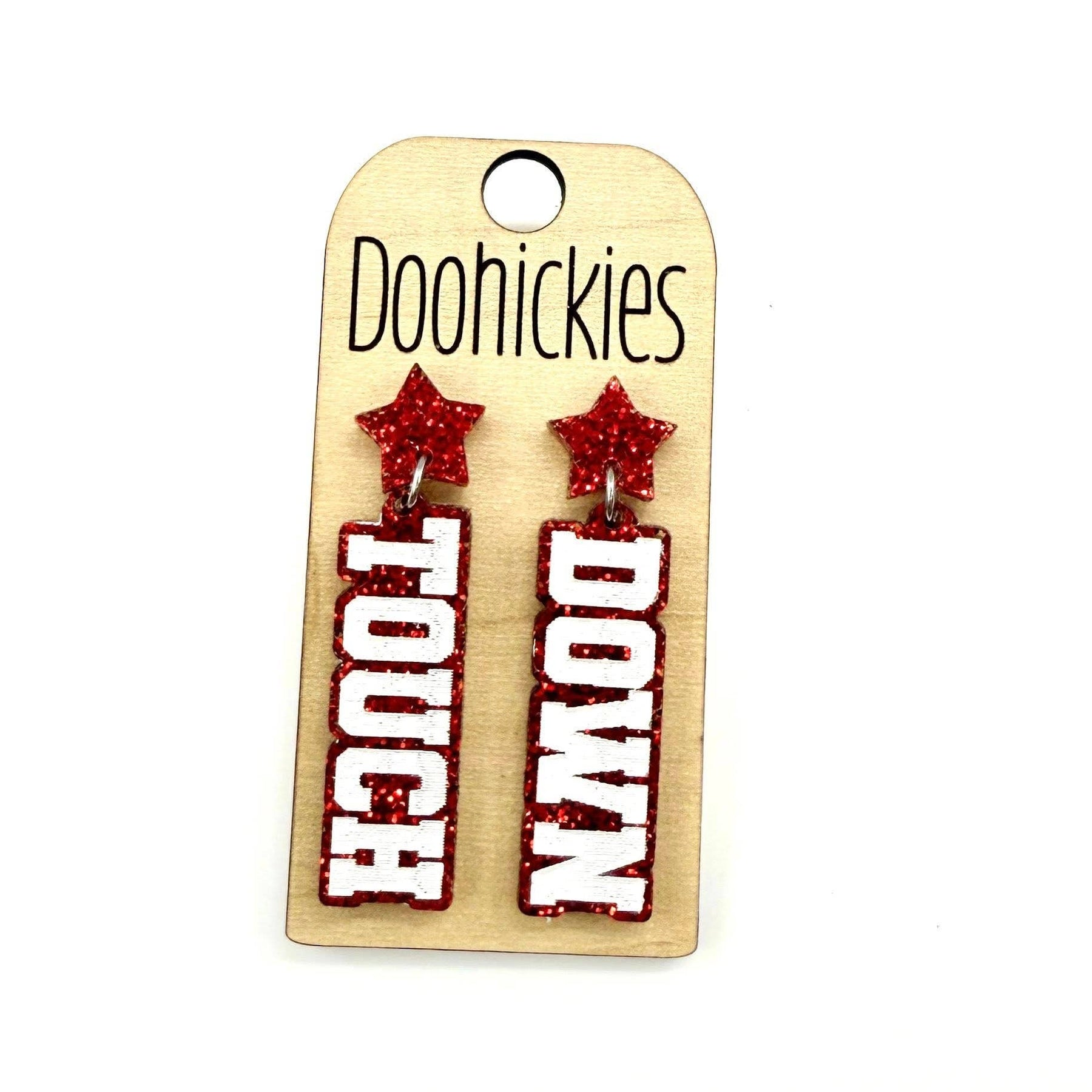 Add some extra sparkle to your school spirit with our customizable Glitter Touch Down Dangles! These quirky earrings will show off your team pride with a playful twist. Choose from a variety of glitter colors to make them truly unique. Go team! Dimensions: .5" x 1.75" Settings Type: Hypoallergenic & Stainless Steel** All settings are lead and nickel free** Materials: Acrylic Ship Time: Please allow up to 10 business days to ship. Lightweight Our earrings are HANDMADE by us in our shop in North Texas. Please, feel free to use our pictures. We do not recommend wearing our product in water.
