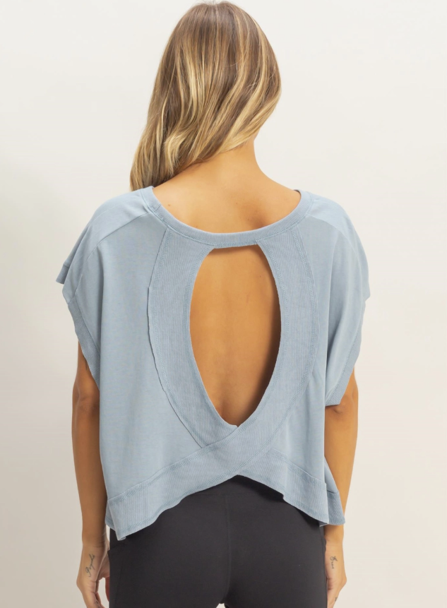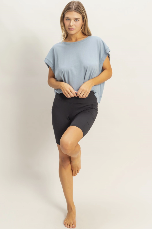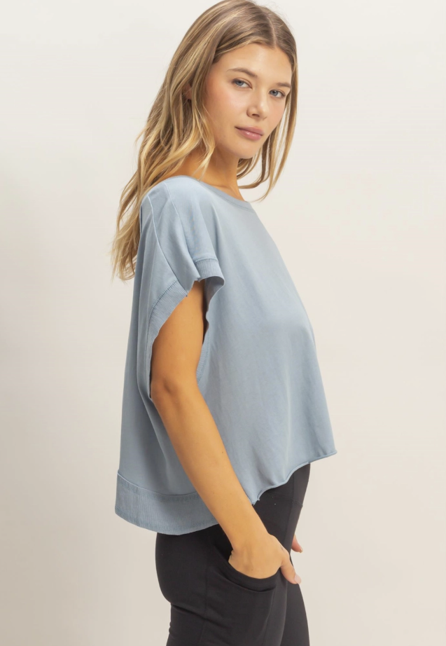 A casual boxy tee with a crew neckline and relaxed sleeves. Pair with distressed denim shorts for a laid-back summer look.