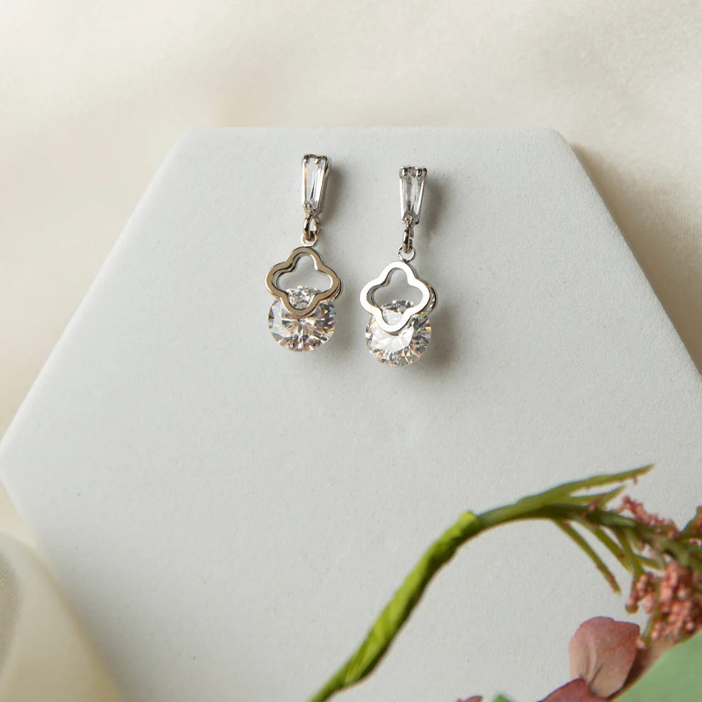 Add a touch of sparkle to your outfit with the Flower Cubic Zirconia Dazzler Drop Earrings. Featuring a gorgeous piece of Cubic Zirconia set onto delicate, gold flowers, these earrings are sure to turn heads.