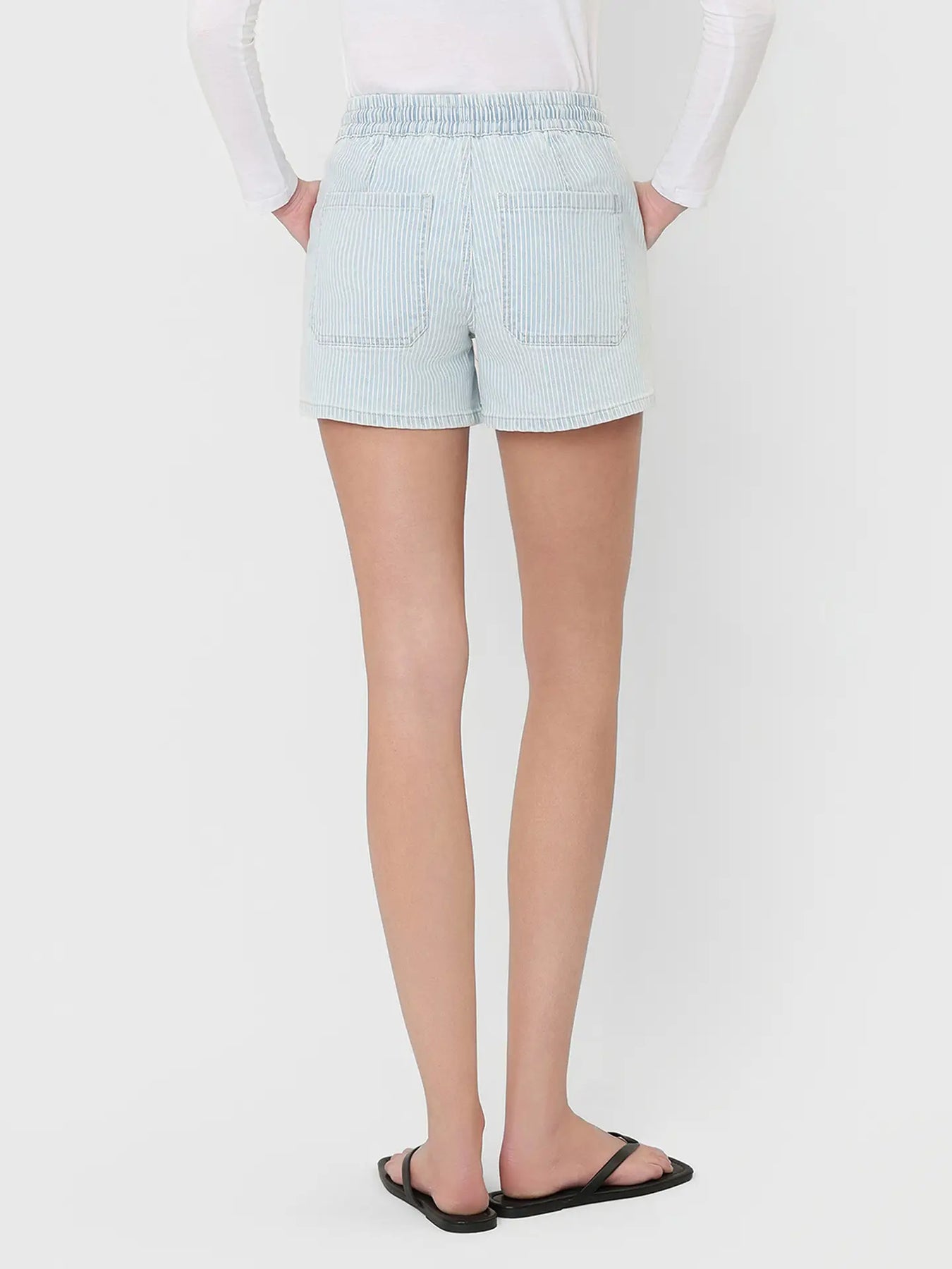 High rise elastic waistband drawstring striped shorts Comfort stretch denim, high rise waist, slant pockets, elastic waistband with drawstring, finished hem, striped shorts