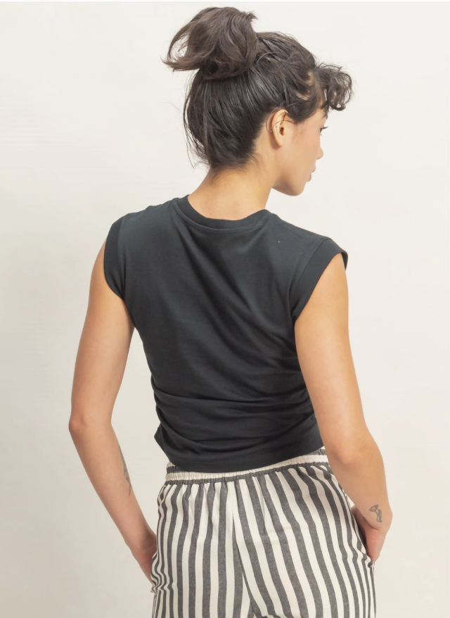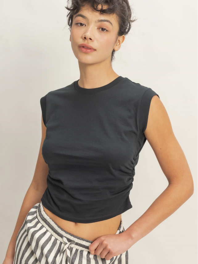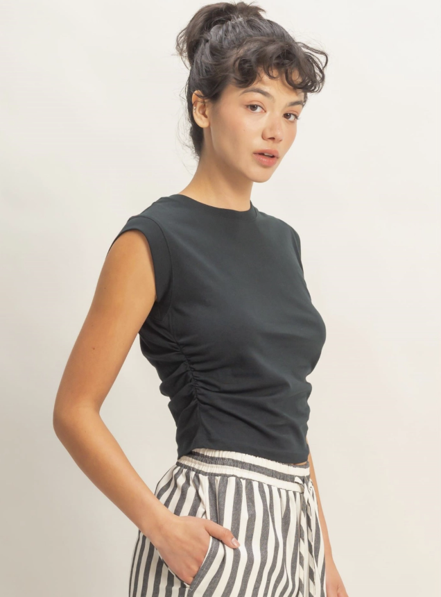 It highlights a classic crew neckline and subtle side shirring at the waist that creates a contoured, flattering silhouette. The smooth back ensures easy layering. Pair this versatile piece under a blazer with tailored pants for a chic office ensemble.