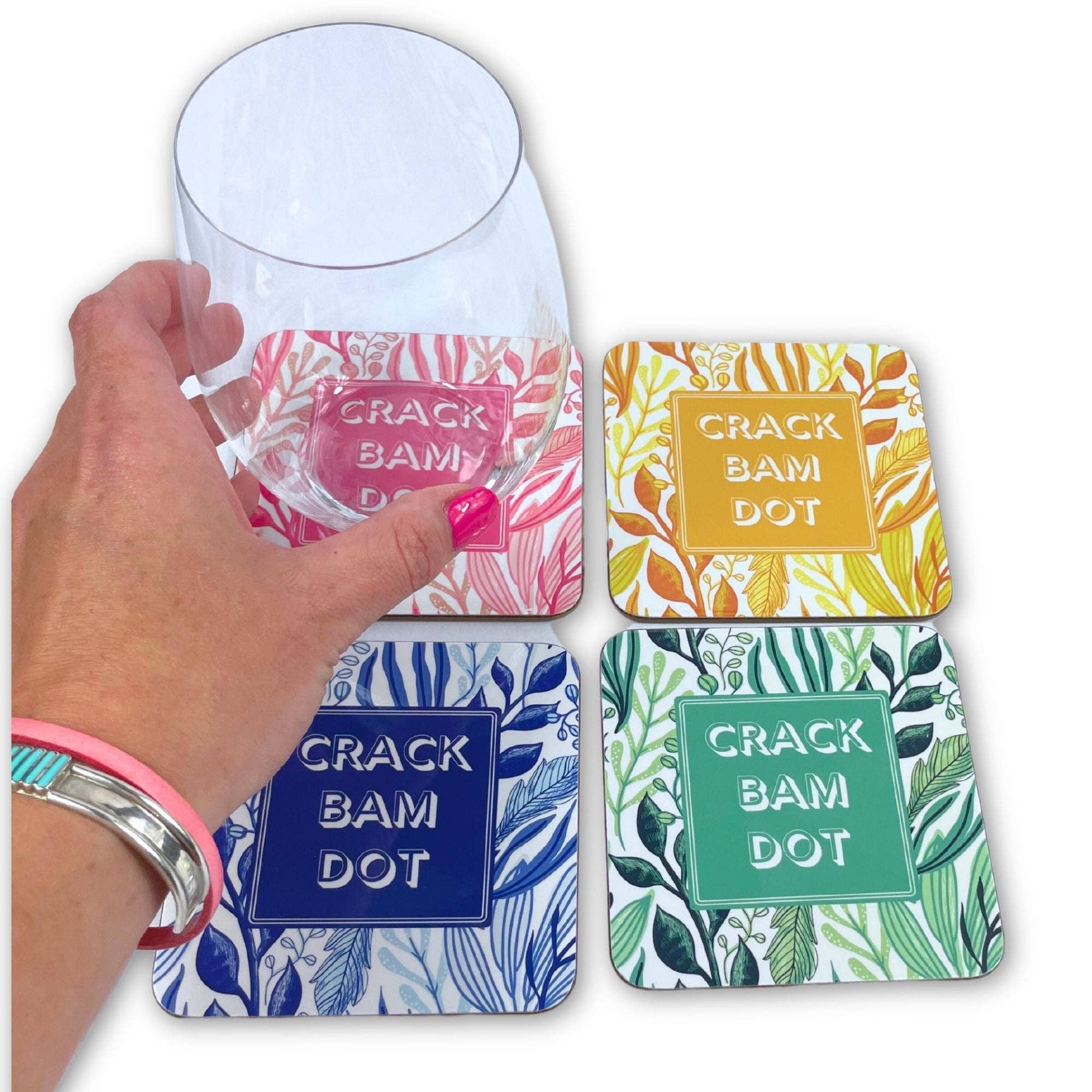 Our most popular coaster design- this set of 4 comes in 4 colors of our nature pattern. It features the words "Crack Bam Dot" on each which Mahjong players love love love! These are 4x4" each, and the set is packaged in a clear plastic box with our brand on the back. The pink coaster is on the top of the stack and showing on the package. - Dimensions: 4x4 inches each - Cork backed, wooden coasters - Comes in a set of 4 with all 4 colors represented in each set