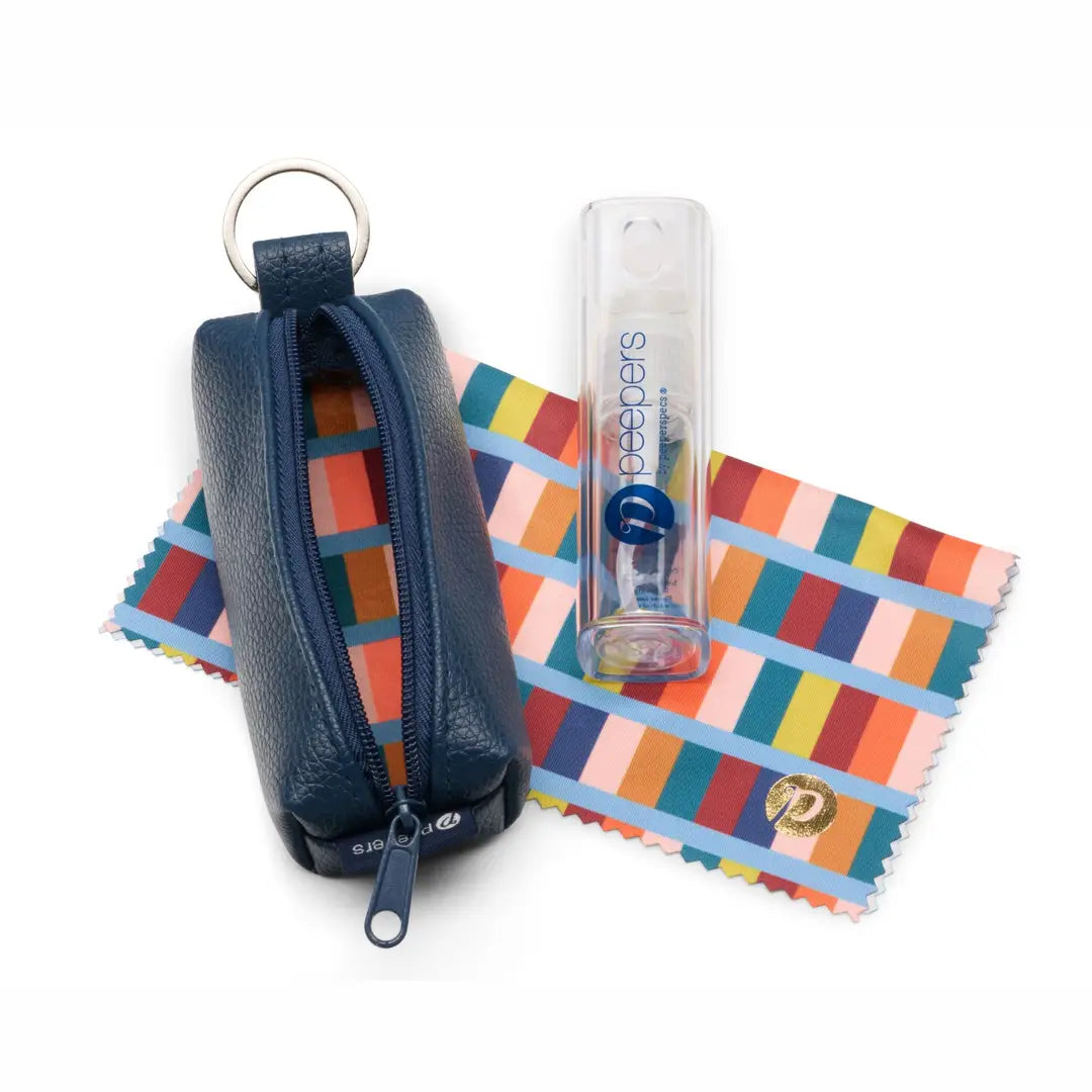 The Key Ring Cleaning Kit packs essential eyewear care into one colorful, convenient package you can take anywhere. Featuring a vibrant rainbow-striped microfiber cloth that wipes away smudges in seconds, a travel-sized lens cleaner, and a sleek portable case with key ring attachment—this trio keeps your favorite frames looking fresh without slowing you down. Clip it to your bag, keys, or backpack for on-the-go cleaning that fits seamlessly into everyday life.