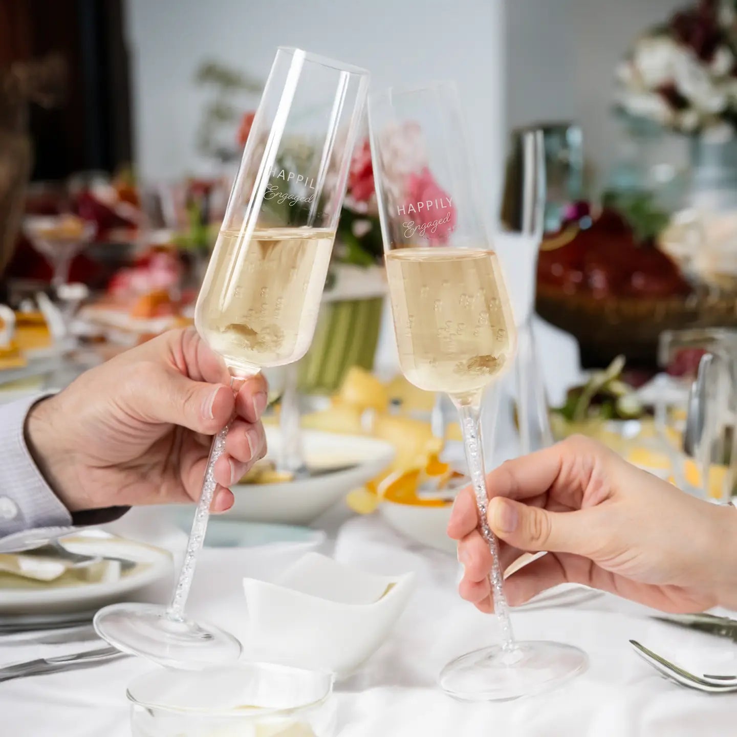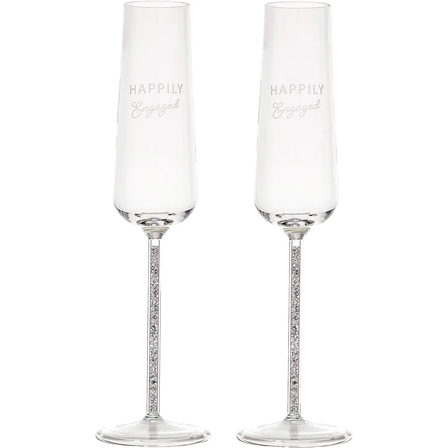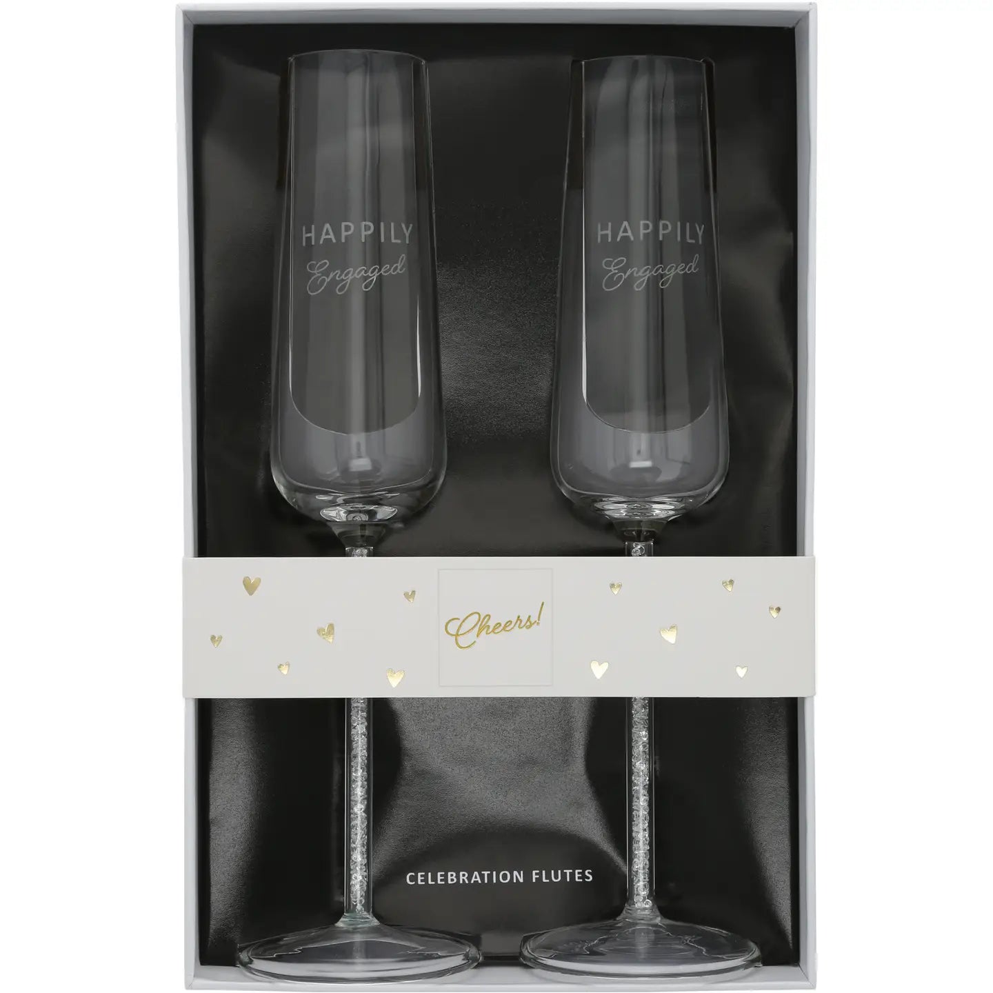 This wonderful set of champagne flutes is crafted from glass with sparkly clear crystal gems within the stemmed glassware. The black background white gift box has heat-stamped hearts on the "Congrats On Your Engagement" lid and a wrapped belly band with a "Cheers!" sentiment. . The champagne glasses have a "Happy Engaged" laser engraved on the front. They're securely twist-tied into the box for safe shipping. . Hand wash only with warm soapy water. Do not leave soaking in water for extended periods of time. Dry immediately with gentle care. Wonderful for a newly engaged couple excited to celebrate their next big life event, marriage. Soon-to-be husbands and soon-to-be wives will be thrilled by this set, which is classy, timeless, and thoughtfully packaged for fiances & fiancees.
